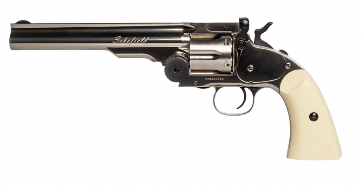 Пневматический револьвер ASG Schofield-6 silver. Компания Action Sport Games выпустила новую реплику боевого оружия - револьвера системы Смита-Вессона. Schofield-6 - пневматический газобаллонный револьвер, выполненный в цвете steel grey (серый стальной). Для стрельбы из револьвера Schofield используются свинцовые пули калибра 4,5 мм. Магазин барабанного типа вмещает в себя 6 фальшпатронов. Начальная скорость полета снаряда - 128 м/с. Источником энергии являются 12-ти граммовые баллончики СО2, устанавливаемые в рукоять револьвера. Револьвер ASG Schofield-6 в длину составляет 320 мм, при этом его масса равна 1,085 кг. Револьвер ASG выполнен из высокопрочных материалов. Металлический корпус обеспечит продолжительный срок службы револьвера. Особенности модели: