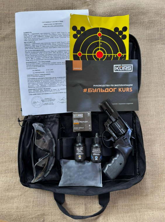 В том числе вы можете купить БУЛЬДОГ KURS наложенным платежом, когда заказ можно будет оплатить при получении в СДЕКе (подробную информацию вы увидите во время оформления заказа). При получении в СДЕКе можно в том числе оплатить кредиткой (чтобы воспользоваться льготным периодом). Во вкладке ВИДЕО можно посмотреть промо-ролик про изделие Бульдог. Или вот прямая ссылка на ролик в Ютубе. Револьвер БУЛЬДОГ KURS - это новый пистолет от завода KURS, не имеющий аналогов в России. Главное, что вы должны о нем знать - он стреляет резиновыми шарами и при этом продается без лицензии. Новаторское решение состоит в том, что револьвер использует энергию монтажных патронов Хилти 5,6 мм. Поэтому БУЛЬДОГ, так же, как строительные пистолеты, не относится к оружию. Купить БУЛЬДОГ KURS можно свободно - это КСОИ (конструктивно схожее с оружием изделие), поэтому по закону оружием не является. Никаких требований по покупке/хранению/регистрации НЕТ. Приобретается абсолютно свободно! Внешний вид и материалы: БУЛЬДОГ это надежный револьвер со стальным стволом и барабаном. При длине 183 мм и высоте 143 мм, вес револьвера составляет незначительные 740 грамм. Для облегчения веса рамка и кожух ствола выполнены из сплава ZAMAK. Внешне БУЛЬДОГ напоминает строгие классические револьверы Smith&Wesson. Техническая начинка: Емкость стального барабана составляет 6 патронов и 6 шариков. Для метания резиновых шаров БУЛЬДОГ использует монтажные патроны калибра 5,6/16. Рекомендованы к использованию патроны только с латунной гильзой (стальные гильзы плохо извлекаются после отстрела барабана). Диаметр шаров 10 мм при весе 0,7 грамма. Если снарядить револьвер только патронами и не снаряжать шарами, то вы получите устройство для подачи звуковых сигналов. Громким монтажным патроном можно отпугнуть людей нарушающих личное пространство, агрессивных собак, диких зверей. Револьвер не имеет предохранителя, но стрельба с ним безопасна поскольку для того, чтобы произошел выстрел будет необходимо предварительно взвести курок, либо сделать большее усилие при нажатии спускового крючка. Конструкция револьвера исключает применение патронов, используемых в стандартном оружии, а для исключения возможности стрельбы стальными шарами в канале ствола установлен стальной штифт (в нижней части, т.н. зуб). Комплект револьвера включает все необходимое: 1. Сумка для транспортировки и хранения (1 шт.) 2. Руководство-паспорт (1 шт.) 3. Мишени самоклеющиеся (3 шт.) 4. Защитные очки для стрельбы (1 шт.) 5. Нейтральное оружейное масло (1 шт.) 6. Средство для удаления нагара (1 шт.) 7. Ёршик для чистки (1 шт.) 8. Патроны 5,6/16 (100 шт.). С января 2025 Бульдог комплектуется патронами KURS в черной пачке. Они тоже с латунной гильзой, как и Хилти 9. Шарики резиновые (100 шт.) ПОЧЕМУ БУЛЬДОГ НЕ ОРУЖИЕ? Револьвер БУЛЬДОГ KURS, в соответствии с сертификатом, является конструктивно сходным с огнестрельным оружием изделием. Его конструкция исключает применение патронов, используемых в стандартном оружии, а удельная кинетическая энергия метаемых резиновых шаров не превышает допустимую величину 0,5 Дж/ мм2. Поэтому пистолет БУЛЬДОГ приобретается без лицензии и не регистрируется в МВД и Росгвардии. Постановление Правительства РФ от 21.07.1998 N 814 статья 34 п.В. МОЖНО ЛИ ОБОРОНЯТЬСЯ БУЛЬДОГОМ? В соответствии со статьей 45 п.2 Конституции РФ каждый вправе защищать свои права и